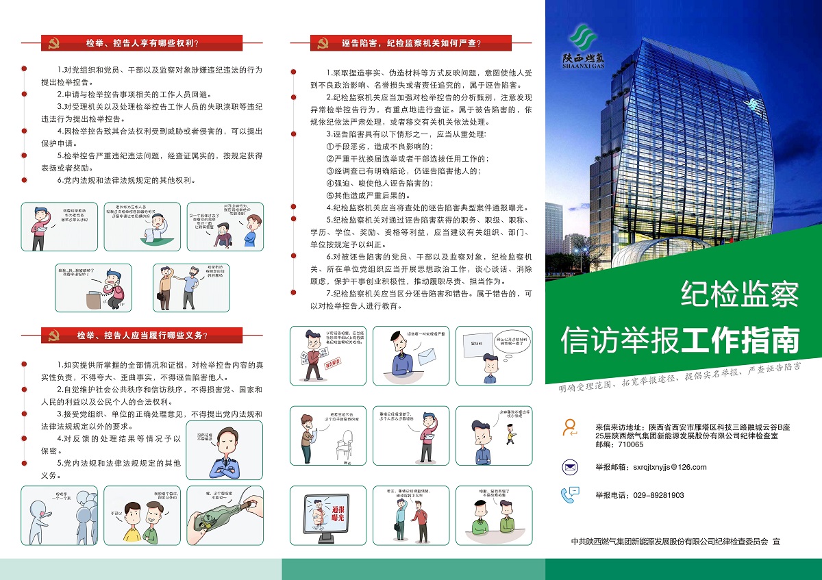 《紀(jì)檢監(jiān)察信訪舉報工作指南》宣傳冊以《紀(jì)檢監(jiān)察機(jī)關(guān)處理檢舉控告工作規(guī)則》為指導(dǎo),涵蓋“紀(jì)檢監(jiān)察機(jī)關(guān)及其工作人員怎么處理檢舉控告工作”、“哪些行為可以向紀(jì)檢監(jiān)察機(jī)關(guān)檢舉控告”、“檢舉、控告人享有哪些權(quán)利”以及新能源公司信訪舉報方式等內(nèi)容,配以漫畫加以解釋,淺顯易懂,有利于提高紀(jì)檢監(jiān)察信訪舉報在群眾中的知曉率,引導(dǎo)廣大職工群眾正確行使檢舉控告權(quán)利。