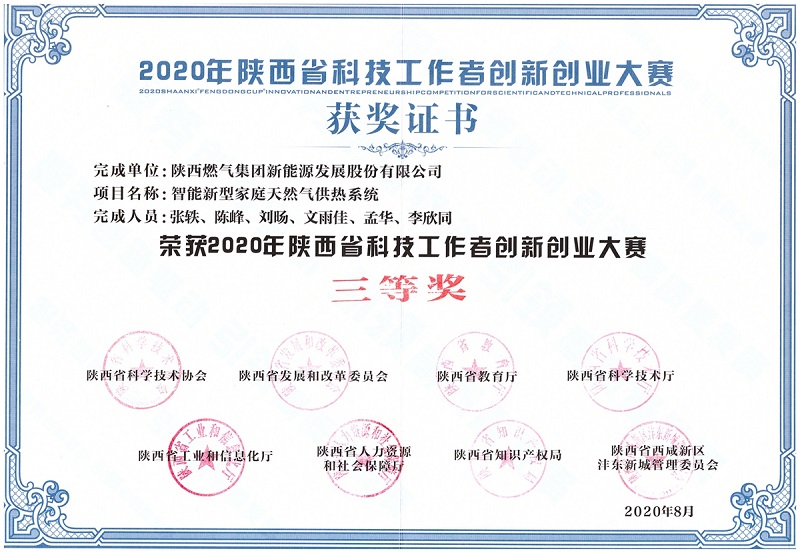 8月27日,2020年“灃東杯”陜西省科技工作者創新創業大賽決賽在灃東新城圓滿落幕。新能源公司參賽項目“智能新型家庭天然氣供熱系統”榮獲大賽三等獎。