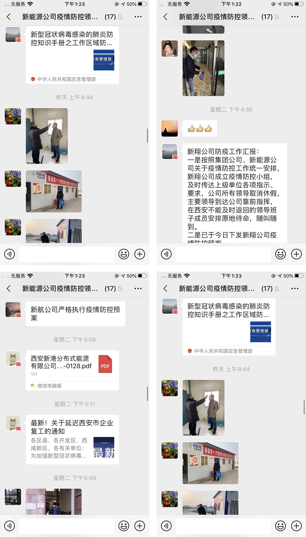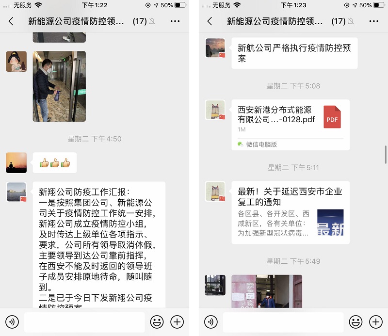 新能源公司系統各部門、各控(參)股公司密切關注本部門、本單位人員情況,通知職工不前往正在發生疫情的地區,密切關注從疫情發生地返回人員,盡量減少到人員密集場所,減少走親訪友、外出聚會,不參加聚集性活動。各控(參)股公司由指定班子成員牽頭負責,每天做好辦公及員工生活區的消毒防護。加強宣傳,通過微信公眾號、微信群推送防控疫情措施,廣泛宣傳新型冠狀病毒的預防知識,科學認識病毒危害,切實提升自我防護意識,教育引導職工及家屬做好個體防護,經常開窗通風,注意個人衛生、勤洗手,出門要佩戴口罩,保持健康的生活方式。