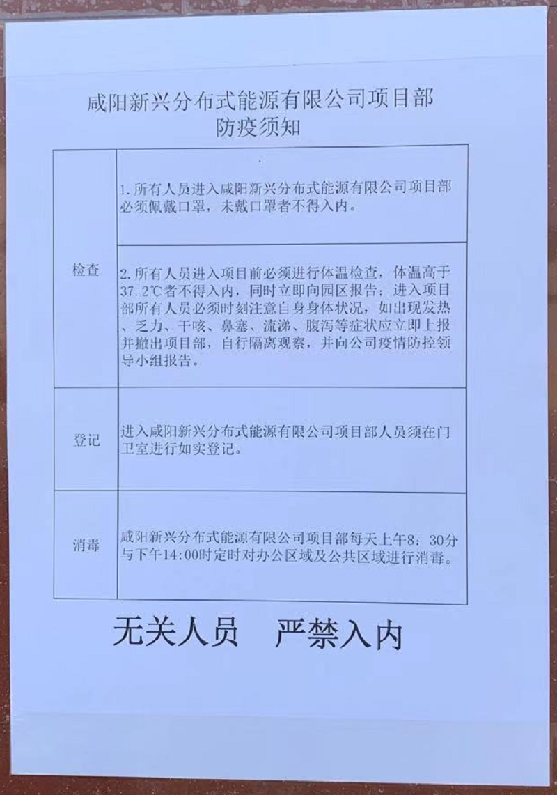 統一思想,高度重視疫情防控工作。為進一步做好疫情防控工作,按照集團公司和新能源公司關于疫情防控工作的安排與部署,新興公司第一時間成立了疫情防控領導小組。疫情防控領導小組及時傳達上級單位關于疫情防控的各項指示與精神,并安排公司疫情防控具體工作。結合公司實際,制定了公司疫情防控預案和延長春節假期值班安排,并對假期值班進行調整,公司所有領導取消休假,隨叫隨到,全天24小時開展疫情排查與防控工作,做到全天候溝通協調,確保政令暢通,保證上級指示要求在第一時間得到有效貫徹落實。